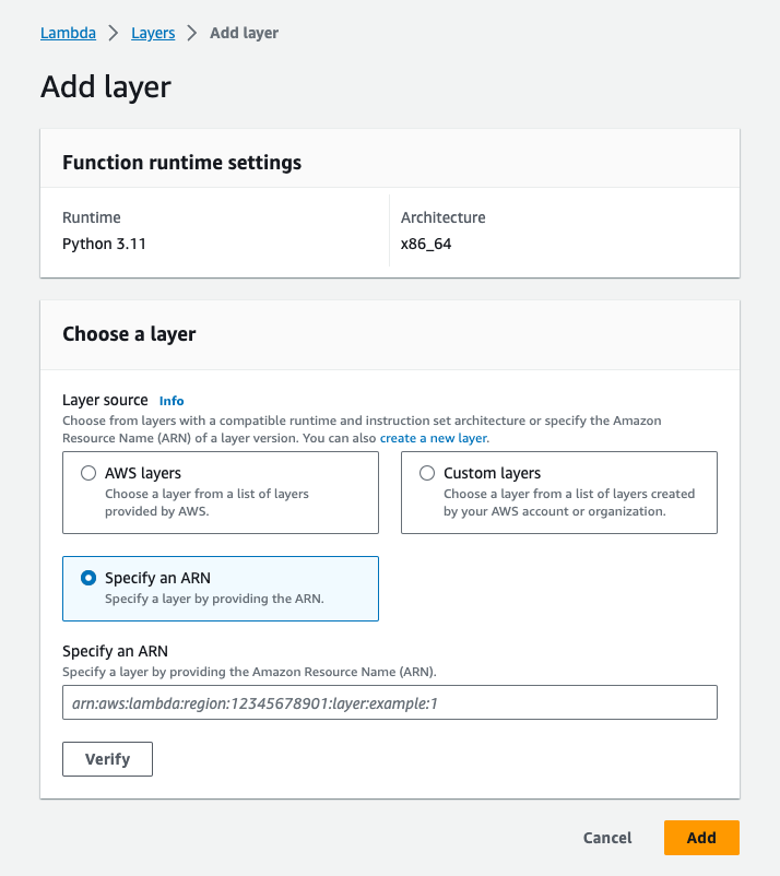 - Lambda Layer Version 77+: Python 3.7, 3.8, 3.9, 3.10, 3.11