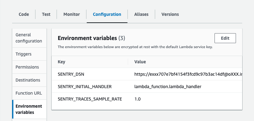 After saving, open the "Configuration" tab of your Lambda Function and set SENTRY_INITIAL_HANDLER to the handler you noted before: